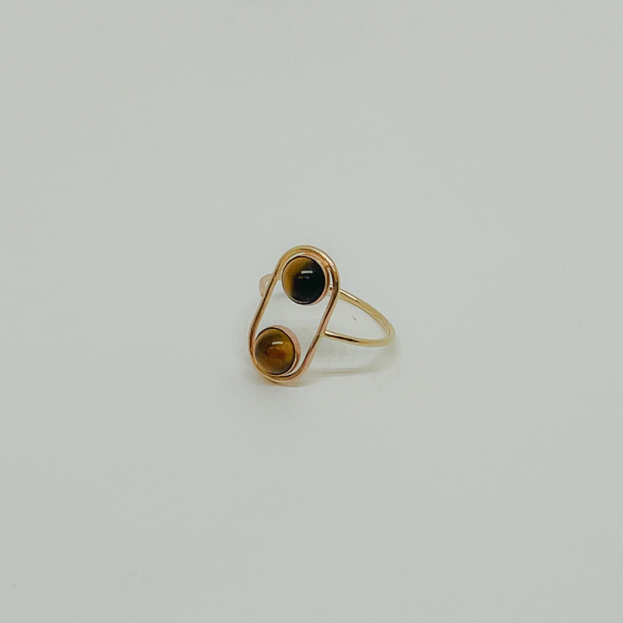 This natural tiger’s eye round cabochon features its distinct signature glow with banded, golden-brown hues that catch and reflect light. Polished round 6mm stones are bezel set in a hand forged 14k gold-fill setting and band.